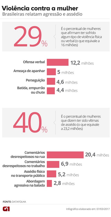 Segundo o Datafolha, 40% das mulheres com mais de 16 anos sofreram assédio dos mais variados tipos em 2016: 20,4 milhões (36%) receberam comentários desrespeitosos ao andar na rua; 5,2 milhões de mulheres foram assediadas fisicamente em transporte público (10,4%) e 2,2 milhões foram agarradas ou beijadas sem o seu consentimento (5%). Adolescentes e jovens de 16 a 24 anos e mulheres negras são as principais vítimas.